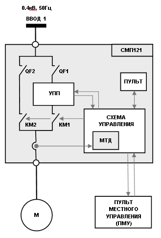 Шкафы серии СМП121 обеспечивают подключение приводного двигателя к питающей сети через УПП или напрямую (резервная схема управления агрегатом). Режим запуска и останова агрегата обеспечивает Устройство Плавного Пуска (УПП), дополнительные, функции мониторинга токовой загрузки, в том числе и при управлении от резервной схемы обеспечивает Монитор Тока Двигателя (МТД). Функции телеметрии обеспечиваются информационным каналом связи стандарта RS485, набором дискретных и аналоговых сигналов, включенных в стандартную комплектацию. Шкафы СМП121 снабжены блоком контроля уровня, обеспечивающим отключение агрегата по сухому ходу. Конструктивно электрооборудование смонтировано в шкафу навесного или напольного исполнения одностороннего обслуживания.